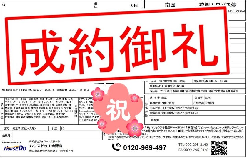◆ 吉野3丁目 新築戸建 ◆ 無事、ご成約致しました♪ 買主様、売主様、この度はご成約おめでとうございます♪