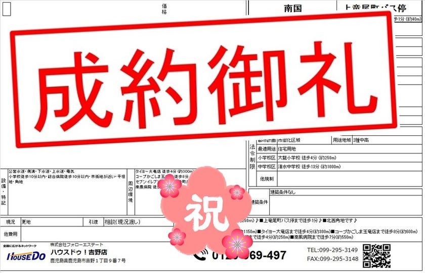 ◆ 上竜尾町 売地 ◆ 無事、ご成約致しました♪ 買主様、売主様、この度はご成約おめでとうございます♪
