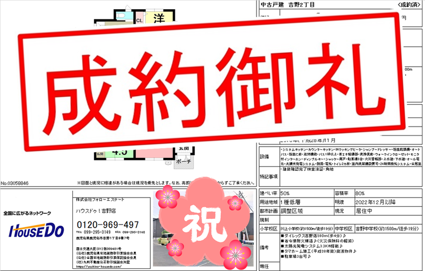 ◆ 吉野2丁目 中古戸建 ◆ 無事、ご成約致しました♪ 買主様、売主様、この度はご成約おめでとうございます♪