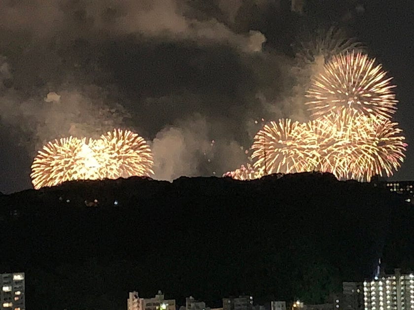 花火が咲いてから10秒後くらいに音が聞こえていました。