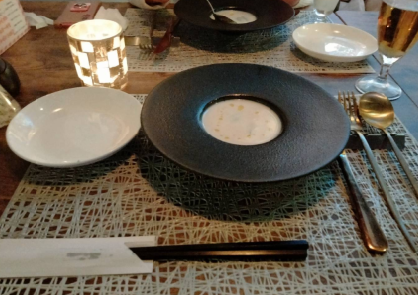 最初のお料理から、シャインマスカットが登場。甘さとみずみずしさが引き立ち前菜、メイン、デザートまで、どのお料理にもシャインマスカットが上手に使われていて、同じ食材なのに表情が全然違うのが印象的でした。