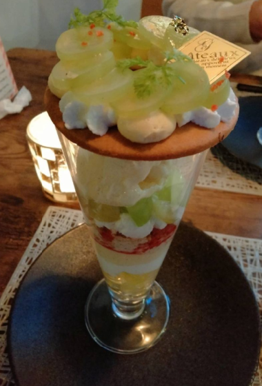 デザートはシャインマスカットのパフェ、甘さと香りが口いっぱいに広がって、コースの締めくくりにぴったりでした。