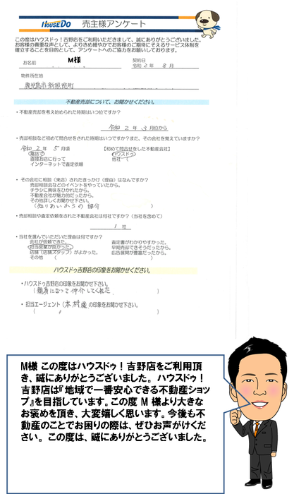 M様 この度はハウスドゥ!吉野店をご利用頂き、誠にありがとうございました。 ハウスドゥ!吉野店は『地域で一番安心できる不動産ショップ』を目指しています。この度 M 様より大きなお褒めを頂き、大変嬉しく思います。今後も不動産のことでお困りの際は、ぜひお声がけください。 この度は、誠にありがとうございました。