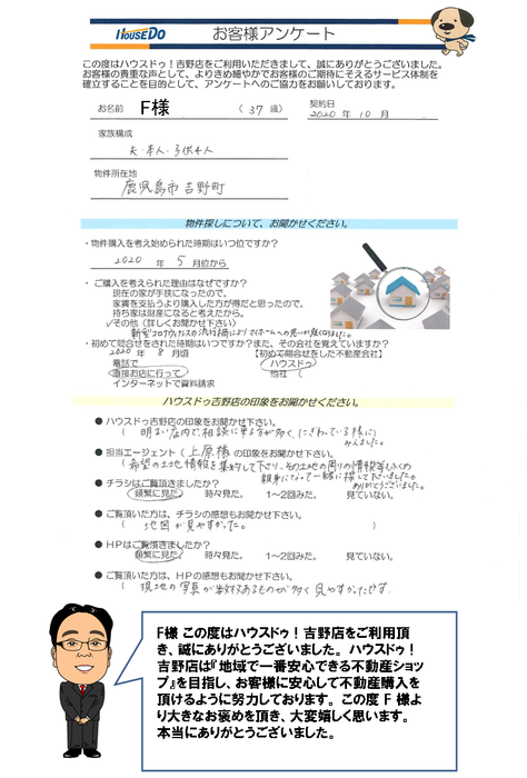 F様 この度はハウスドゥ!吉野店をご利用頂き、誠にありがとうございました。 ハウスドゥ!吉野店は『地域で一番安心できる不動産ショップ』を目指しています。この度 F様より大きなお褒めを頂き、大変嬉しく思います。今後も不動産のことでお困りの際は、ぜひお声がけください。 この度は、誠にありがとうございました。