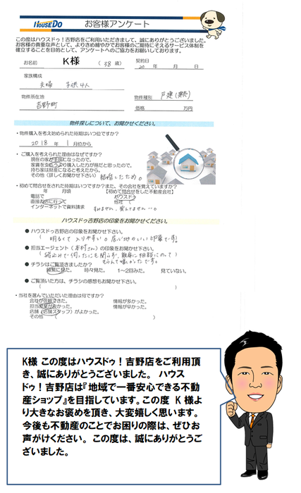 K様 この度はハウスドゥ!吉野店をご利用頂き、誠にありがとうございました。 ハウスドゥ!吉野店は『地域で一番安心できる不動産ショップ』を目指しています。この度 K様より大きなお褒めを頂き、大変嬉しく思います。今後も不動産のことでお困りの際は、ぜひお声がけください。 この度は、誠にありがとうございました。