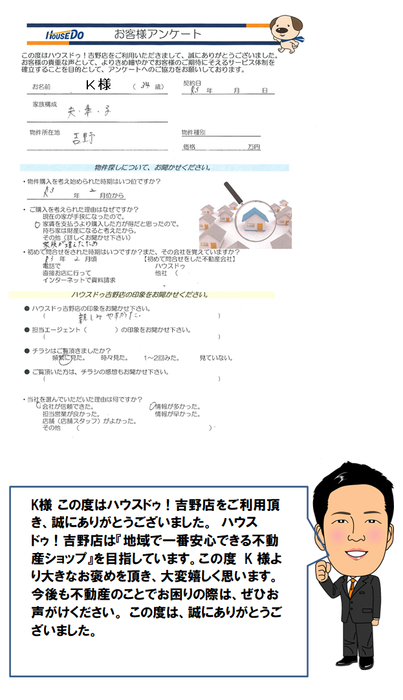 K様 この度はハウスドゥ!吉野店をご利用頂き、誠にありがとうございました。 ハウスドゥ!吉野店は『地域で一番安心できる不動産ショップ』を目指しています。この度 K様より大きなお褒めを頂き、大変嬉しく思います。今後も不動産のことでお困りの際は、ぜひお声がけください。 この度は、誠にありがとうございました。
