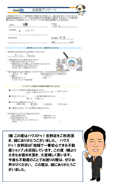 I様 この度はハウスドゥ!吉野店をご利用頂き、誠にありがとうございました。 ハウスドゥ!吉野店は『地域で一番安心できる不動産ショップ』を目指しています。この度I様より大きなお褒めを頂き、大変嬉しく思います。今後も不動産のことでお困りの際は、ぜひお声がけください。 この度は、誠にありがとうございました。