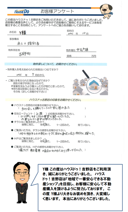 Y様 この度はハウスドゥ!吉野店をご利用頂き、誠にありがとうございました。 ハウスドゥ!吉野店は『地域で一番安心できる不動産ショップ』を目指しています。この度 Y様より大きなお褒めを頂き、大変嬉しく思います。今後も不動産のことでお困りの際は、ぜひお声がけください。 この度は、誠にありがとうございました。