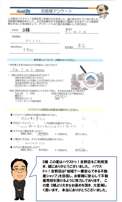 D様 この度はハウスドゥ!吉野店をご利用頂き、誠にありがとうございました。 ハウスドゥ!吉野店は『地域で一番安心できる不動産ショップ』を目指し、お客様に安心して不動産購入を頂けるように努力しております。 この度 D様より大きなお褒めを頂き、大変嬉しく思います。 本当にありがとうございました。