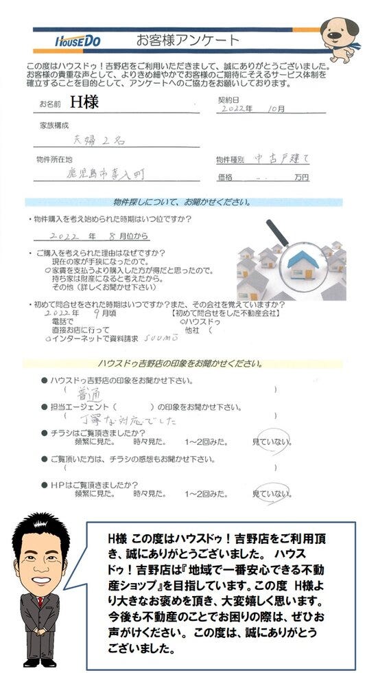 H様 この度はハウスドゥ!吉野店をご利用頂き、誠にありがとうございました。 ハウスドゥ!吉野店は『地域で一番安心できる不動産ショップ』を目指し、お客様に安心して不動産購入を頂けるように努力しております。 この度H様より大きなお褒めを頂き、大変嬉しく思います。 本当にありがとうございました。