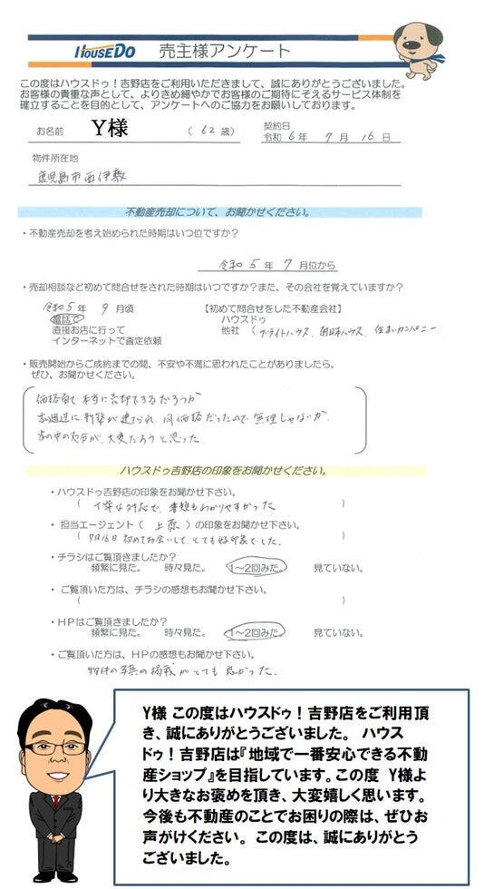 Y様 この度はハウスドゥ!吉野店をご利用頂き、誠にありがとうございました。 ハウスドゥ!吉野店は『地域で一番安心できる不動産ショップ』を目指しています。この度 Y様より大きなお褒めを頂き、大変嬉しく思います。今後も不動産のことでお困りの際は、ぜひお声がけください。 この度は、誠にありがとうございました。