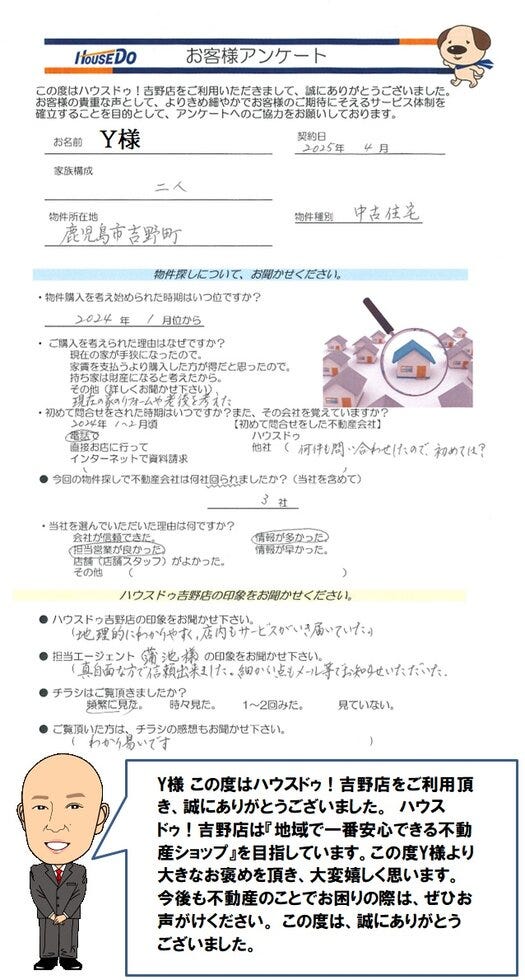 Y様 この度はハウスドゥ!吉野店をご利用頂き、誠にありがとうございました。 ハウスドゥ!吉野店は『地域で一番安心できる不動産ショップ』を目指し、お客様に安心して不動産購入を頂けるように努力しております。 この度 Y様より大きなお褒めを頂き、大変嬉しく思います。 本当にありがとうございました。