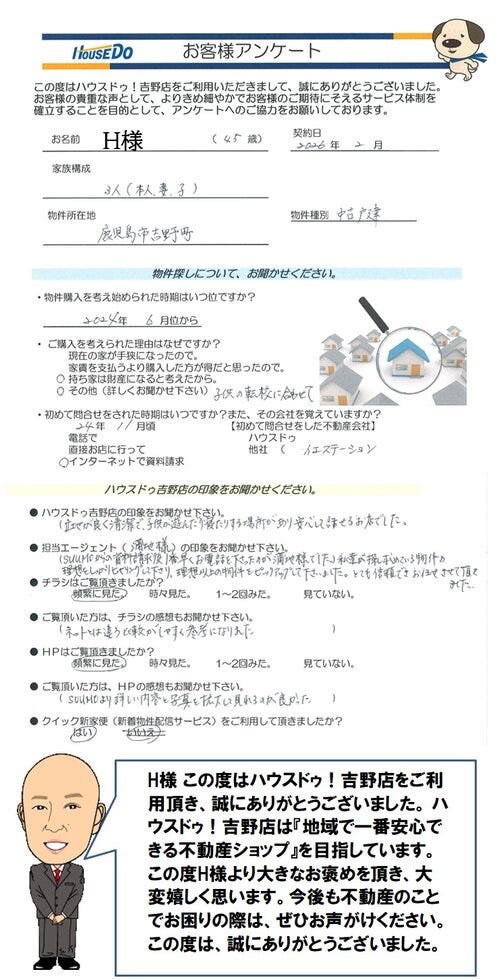 H様 この度はハウスドゥ!吉野店をご利用頂き、誠にありがとうございました。 ハウスドゥ!吉野店は『地域で一番安心できる不動産ショップ』を目指しています。この度H様より大きなお褒めを頂き、大変嬉しく思います。今後も不動産のことでお困りの際は、ぜひお声がけください。 この度は、誠にありがとうございました。