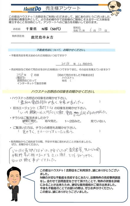 この度はハウスドゥ!吉野店をご利用頂き、誠にありがとうございました。 N様の大切な不動産を売却するにあたり、近隣物件の売却事例調査をし、合わせて訪問査定をさせて頂けたことで、物件の状態を詳細にみることが出来たため、適切な販売価格がご提示出来ました。 今後も不動産のことでお困りの際は、ぜひお声かけください。 この度は、誠にありがとうございました。