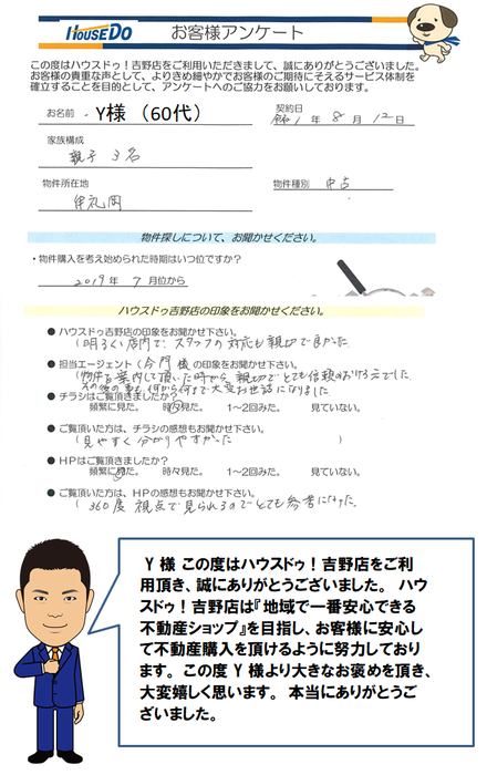 Y様、この度はハウスドゥ!吉野店をご利用頂き、誠にありがとうございました。 不動産屋さんって、正直入りにくいですよね。 ハウスドゥ!吉野店では「地域で一番安心できる不動産ショップ」を目指し努力しています。Y様に「信頼できた。」というお褒めの言葉を頂き、大変うれしく思っております。ありがとうございます。 今後も家・不動産の困ったことがありましたら、お気軽にご相談ください。誠にありがとうございました。